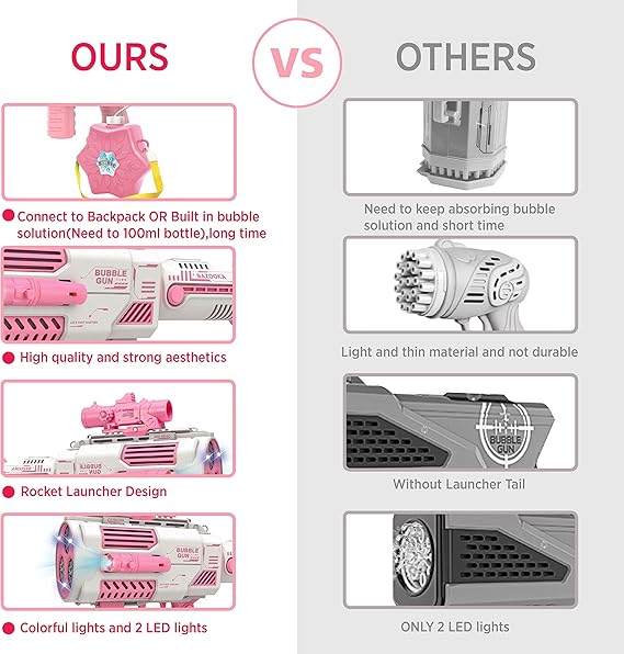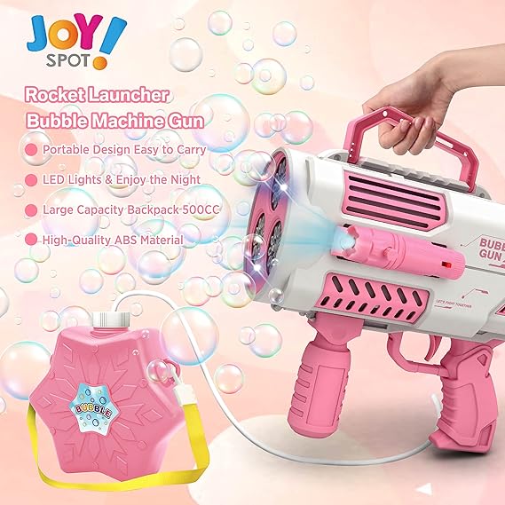 Ovaj pištolj je opremljen ruksakom zapremine 500CC koji sadrži tečnost za mehuriće, omogućavajući kontinuiranu igru bez potrebe za čestim punjenjem. Ovaj dodatak čini igru još zabavnijom i bez prekida!
